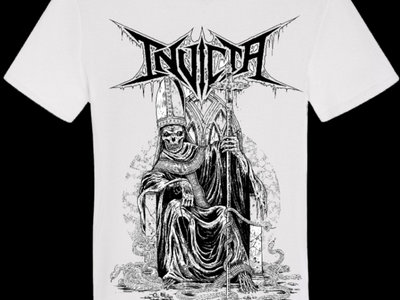 Shirt design for our song Sacred Scourge made by the legendary Mark Riddick on a white t shirt with back print